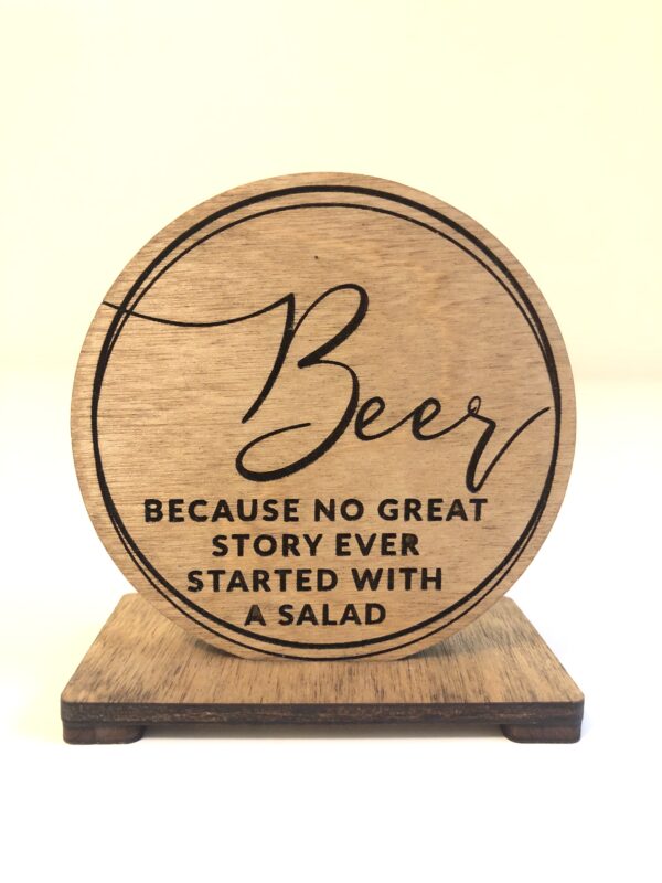 Get a load of our hilarious rustic 3-inch bottle opener proudly proclaiming “Beer, because no great story ever started with a Salad.” Crafted from birchwood with love right here in sunny South Florida, it’s the ultimate must-have for any shindig.